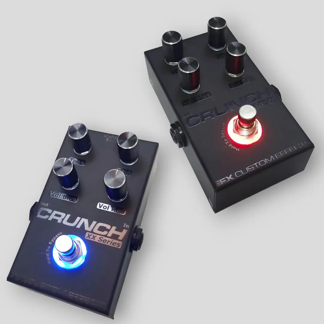Em sua versão XX Series, o Crunch conta com 2 canais de volume, cada um acionado usando apenas um footswitch. Funciona da seguinte forma, com o pedal em Bypass, um clique simples aciona o canal RED, outro clique simples, o canal BLUE, e assim sucessivamente. Caso queira entrar no modo Bypass, basta segurar o footswitch por menos de 1 segundo!