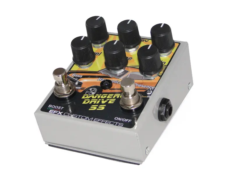Clone do Direct Drive SS da Barber, só que ao invés de usar trimpots internos foram colocados pra fora como potenciometros. Tem as regulagens básicas (drive, tone, level) e as regulagens que eram dos trimpots (bass, harmonics, presence). Além disso possui um segundo footswitch de BOOST, para dar um boost de volume para destacar o som em solos, que funciona quando a distorção esta ligada.