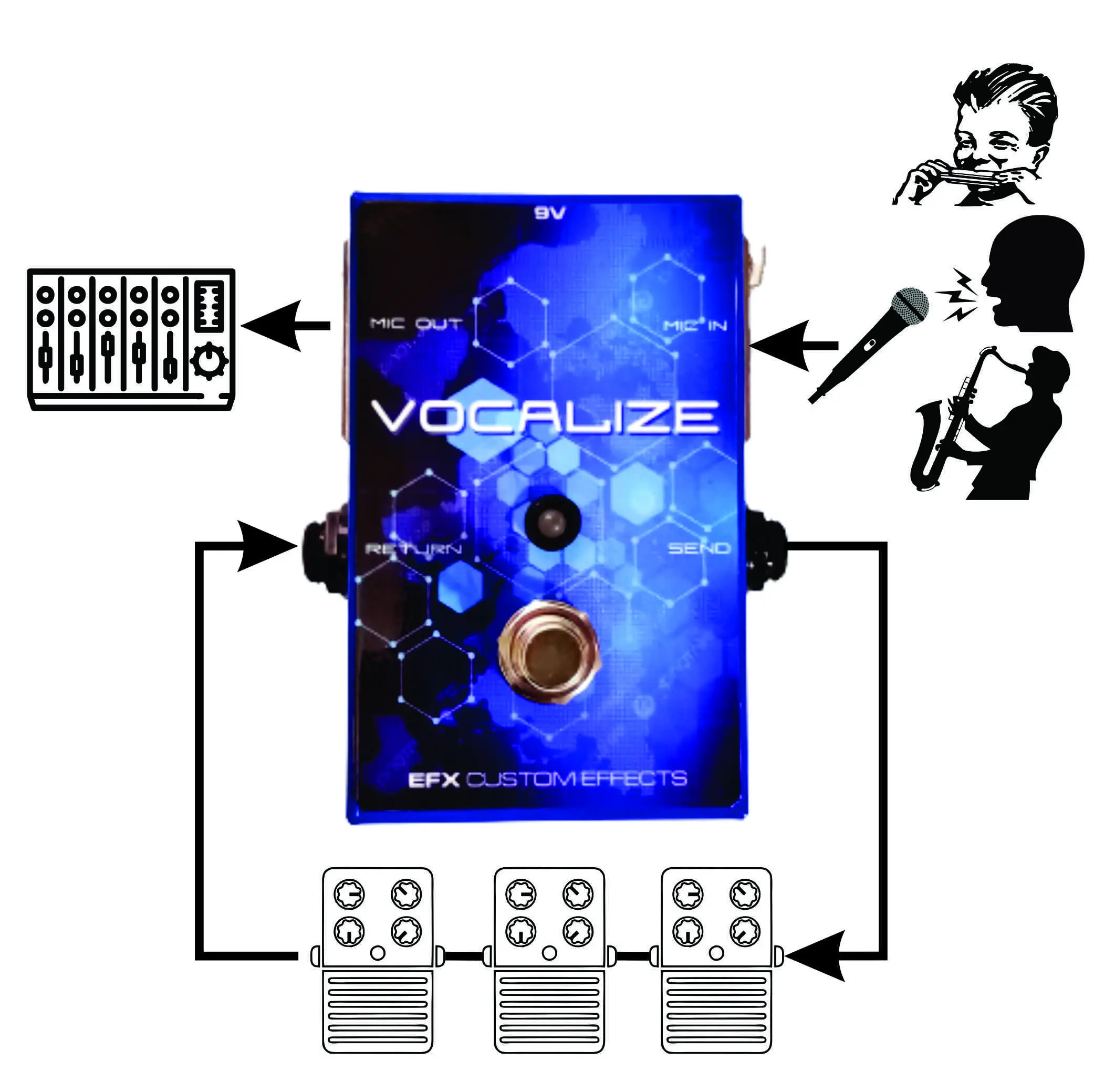 O Vocalize EFX é uma interface que permite usar um loop de pedais de efeitos em um sinal microfonado. Pode ser usado tanto para voz quanto para instrumentos microfonados como instrumentos de sopro (gaitas, saxofones, trompetes, etc).